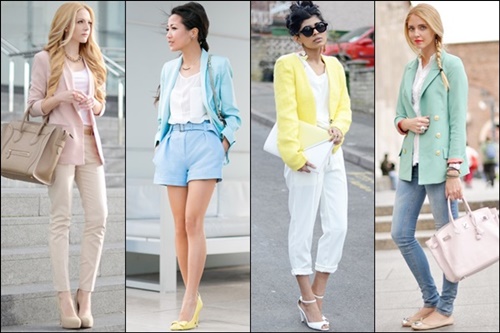 Đối với một cái nhìn nữ tính hơn, gam màu pastel có thể là lựa chọn tốt nhất của bạn để mặc trong những dịp bình thường. Chọn một chiếc blazer màu pastel và kết hợp với trang phục sáng màu, mỏng nhẹ để đơn giản hóa trang phục thường nhật.
