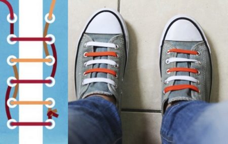 Nếu bạn vẫn chưa ưng ý với kiểu thắt dây 1 màu. Bạn có thể biến đôi giày của mình trở nên nổi bật và phá cách hơn, bằng cách áp dụng cách buộc dây bằng 2 dây giày có 2 gam màu khác nhau.