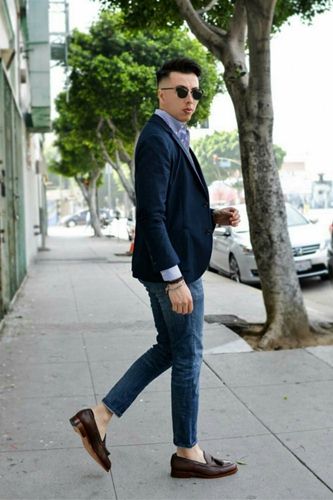 Ngay cả chiếc áo sơ mi và blazer vốn rất trang trọng cũng được trẻ trung hóa nhờ quần jeans xanh đậm và đôi giày lười.